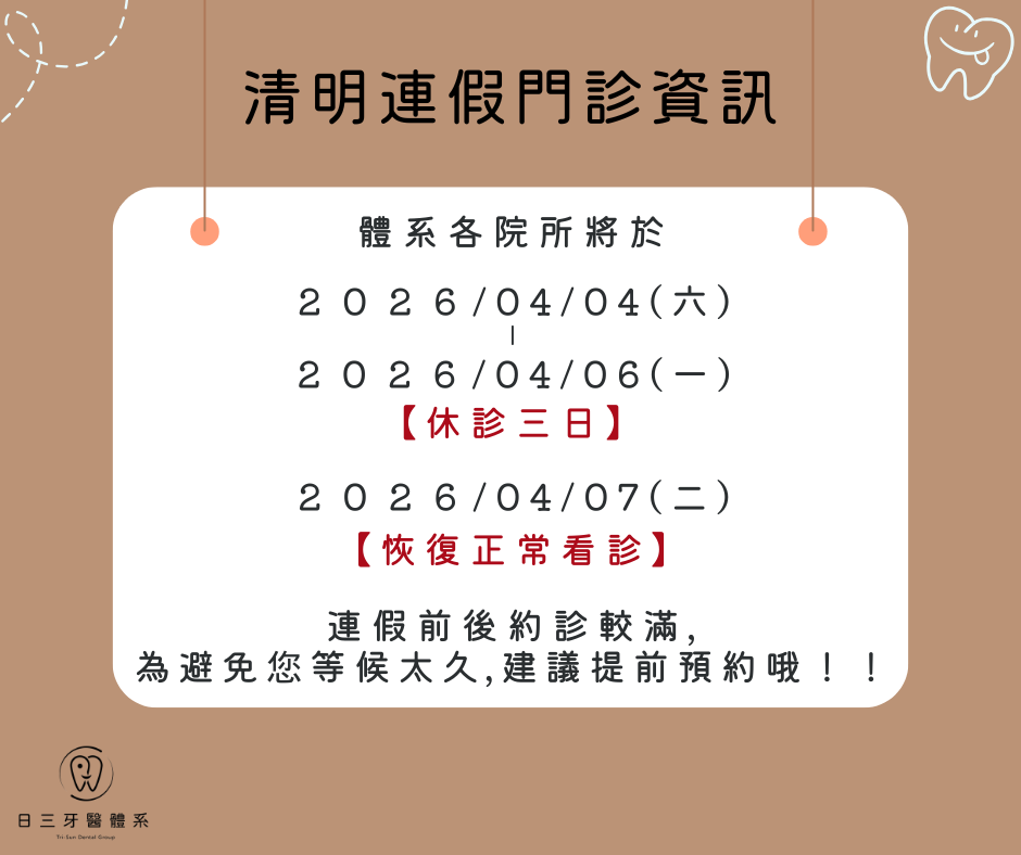 春節連假及228門診資訊 因應清明連續假期,日三牙醫體系各院所門診時間調整如下:休診時間2026年04月04日(六)至 2026年04月06日(一) 【休診三日】恢復看診2026年04月07日(二)起恢復正常門診 連假前後看診需求較多 為避免現場等候時間較長,建議您提前預約門診時段感謝您的理解與配合日三牙醫體系祝您清明連假平安順心歡迎利用線上約診系統👉 預約晶悅專業醫師評估 / 預約晶睿專業醫師評估 / 預約寶貝牙專業醫師評估 / 預約晶匯專業醫師評估 分享到 日三牙醫體系